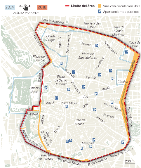 La escala en la que analizaremos nuestro escogido conflicto será el área de Madrid central, limitándonos así a sus 472 hectáreas, en las cuales se agrupan las cuatro APR (Áreas de Prioridad Residencial del Ayuntamiento de Madrid) actuales: Letras, Cortes, Embajadores y Ópera. Cabe añadir, con tal de concluir este primer apartado, que el perímetro que constituye Madrid central está conformado por las calles: Alberto Aguilera, Glorieta de Bilbao, Plaza de Alonso Martínez, Plaza de Colón, Paseo de Recoletos, Paseo del Prado, Ronda de Atocha, Ronda de Toledo, Ronda de Segovia, Calle Bailén, Plaza de España y Calle Princesa.